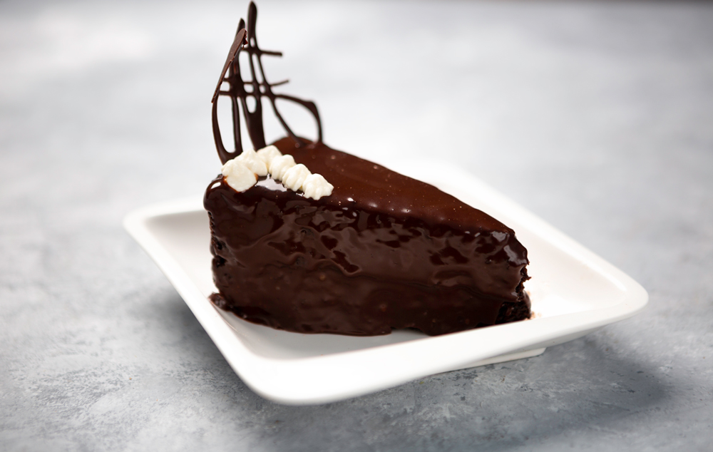 Bizcocho húmedo de chocolate, relleno con fondant de chocolate, cubierto con una pequeña capa de miel de maracuyá y fondant de chocolate