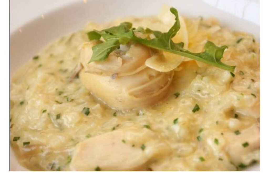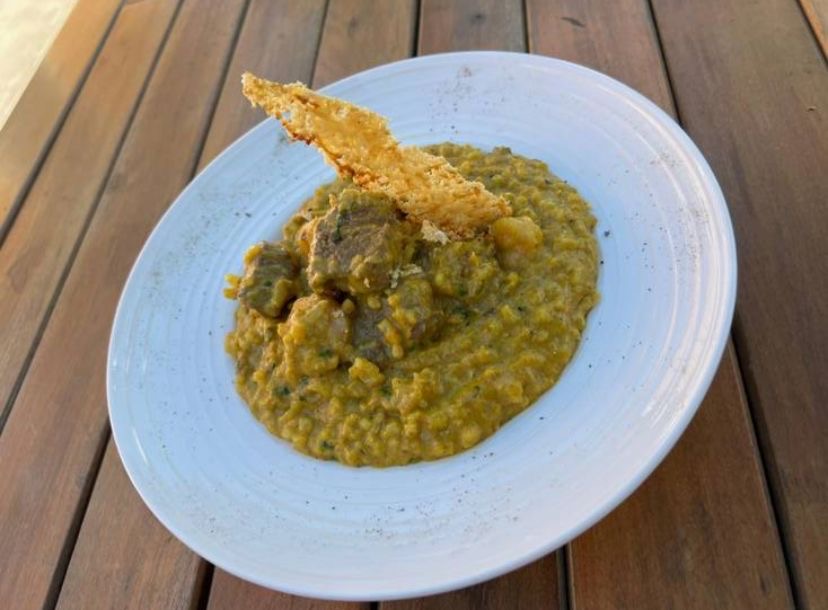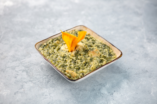 Espinaca blanqueada, papas y verduras salteadas, cocinadas en fondo de verduras y un toque de crema de leche.