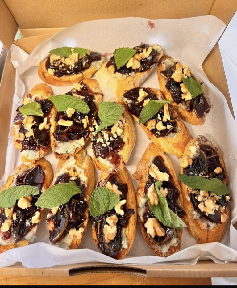 Bruschettas untadas con queso azul, peras caramelizadas en reducción de vino tinto carmenere, aromatizado con canela y cascara de naranja; terminadas con nuecesy un toque de menta.