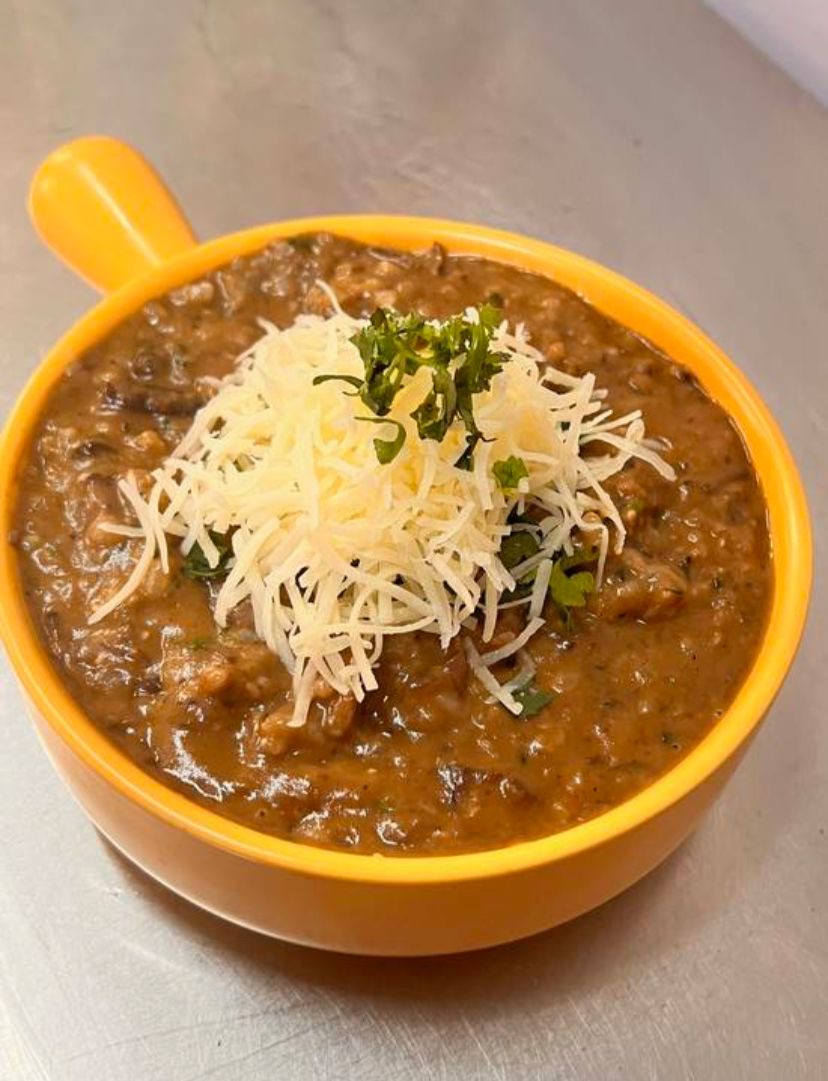 Champiñones salteados en mantequilla, papas, mix de verduras salteadas, desglasadas con fondos de verduras y un toque de crema de leche, todo esto licuado.